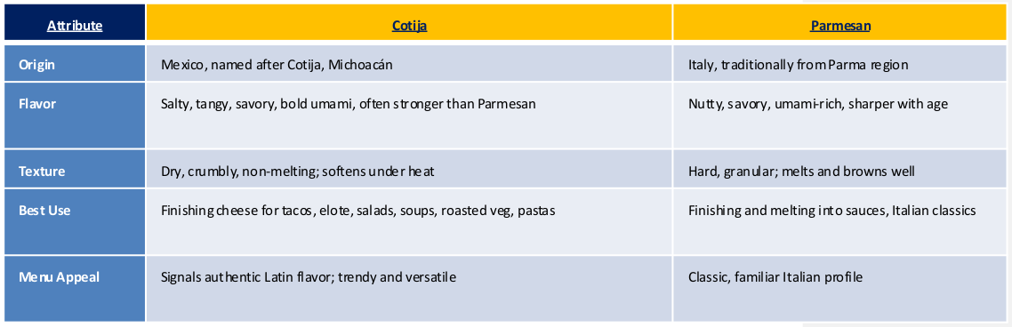 Parmesan remains a staple in Italian cooking—pasta, risotto, salads, and baked dishes—but Cotija allows restaurants and consumers to deliver a similar boost of umami with a distinctly Latin flair. This gives menus a fresh, on-trend angle while still feeling familiar to guests who love grated hard cheeses.